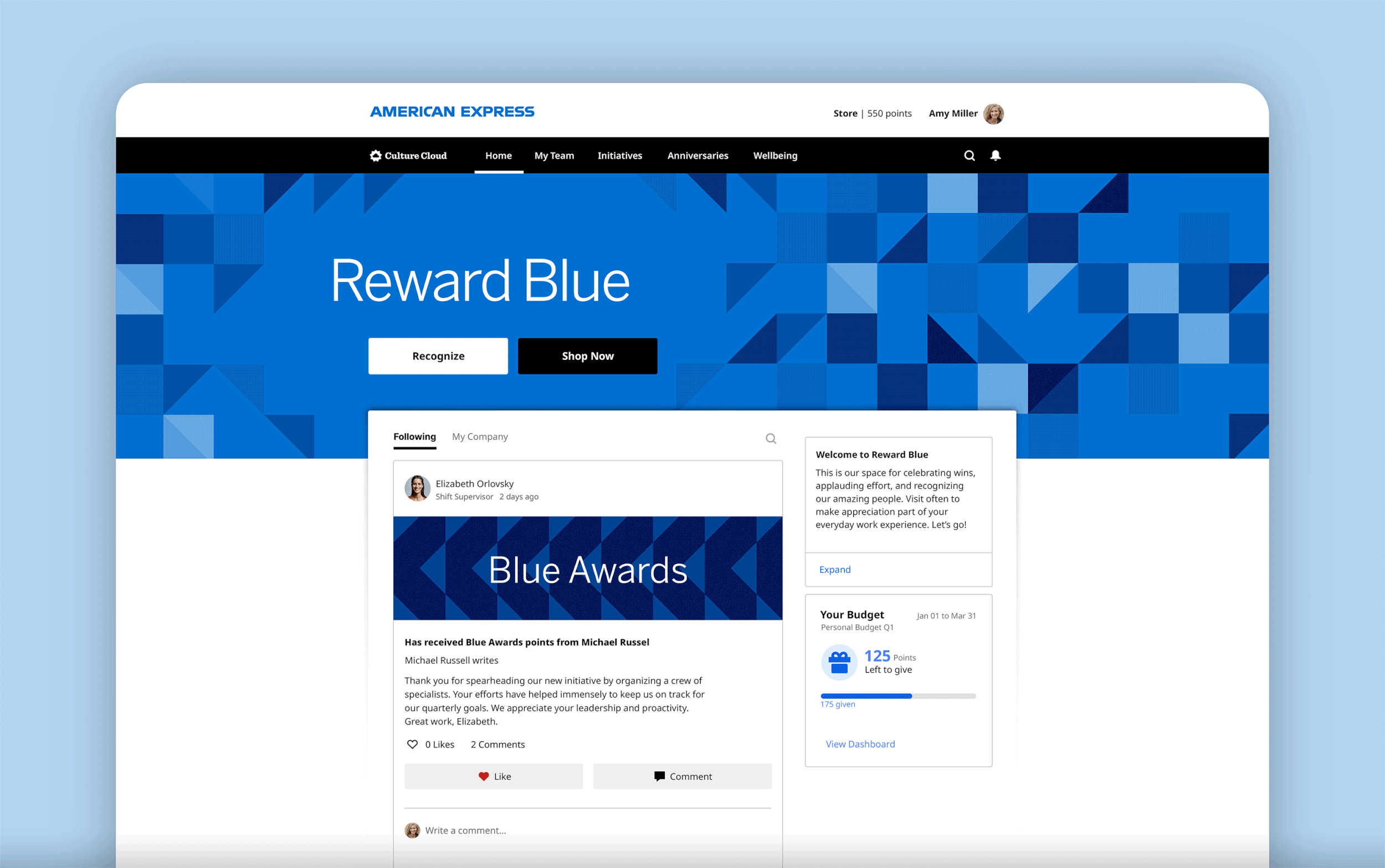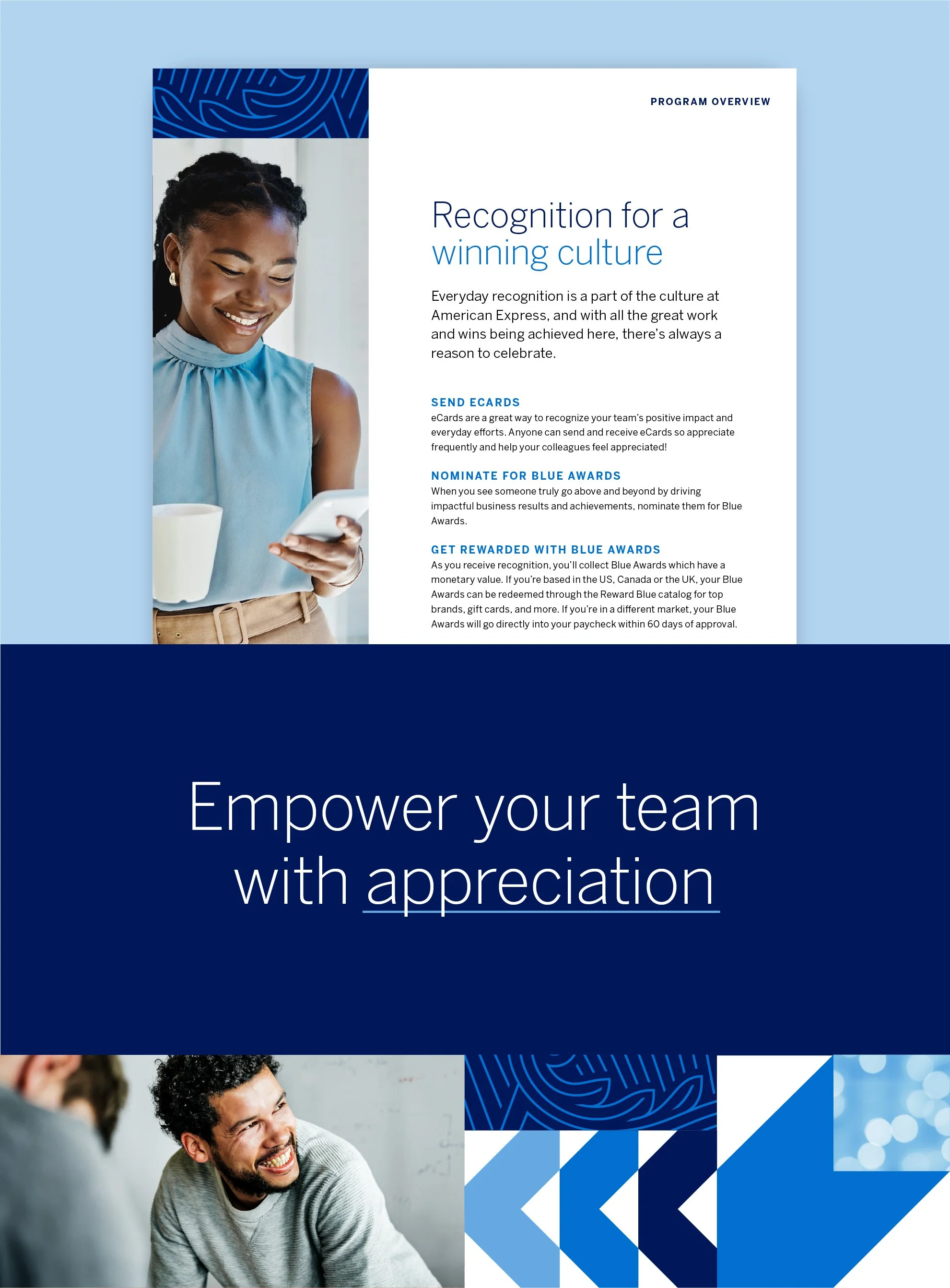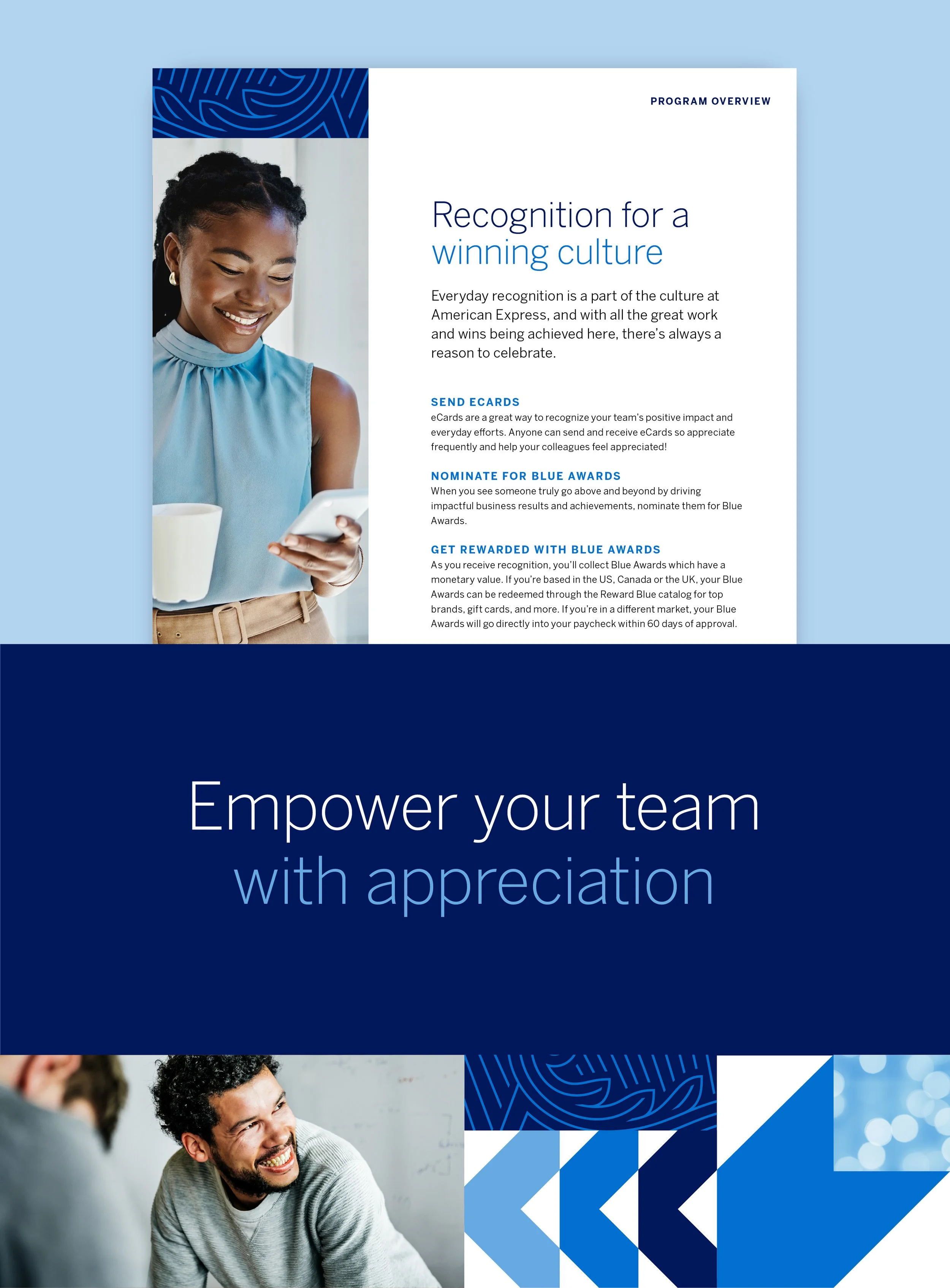 American Express partnered with O.C. Tanner to re-energize their Reward Blue internal recognition program—powered by the Culture Cloud platform—with a brand experience that felt both celebratory and distinctly AMEX.